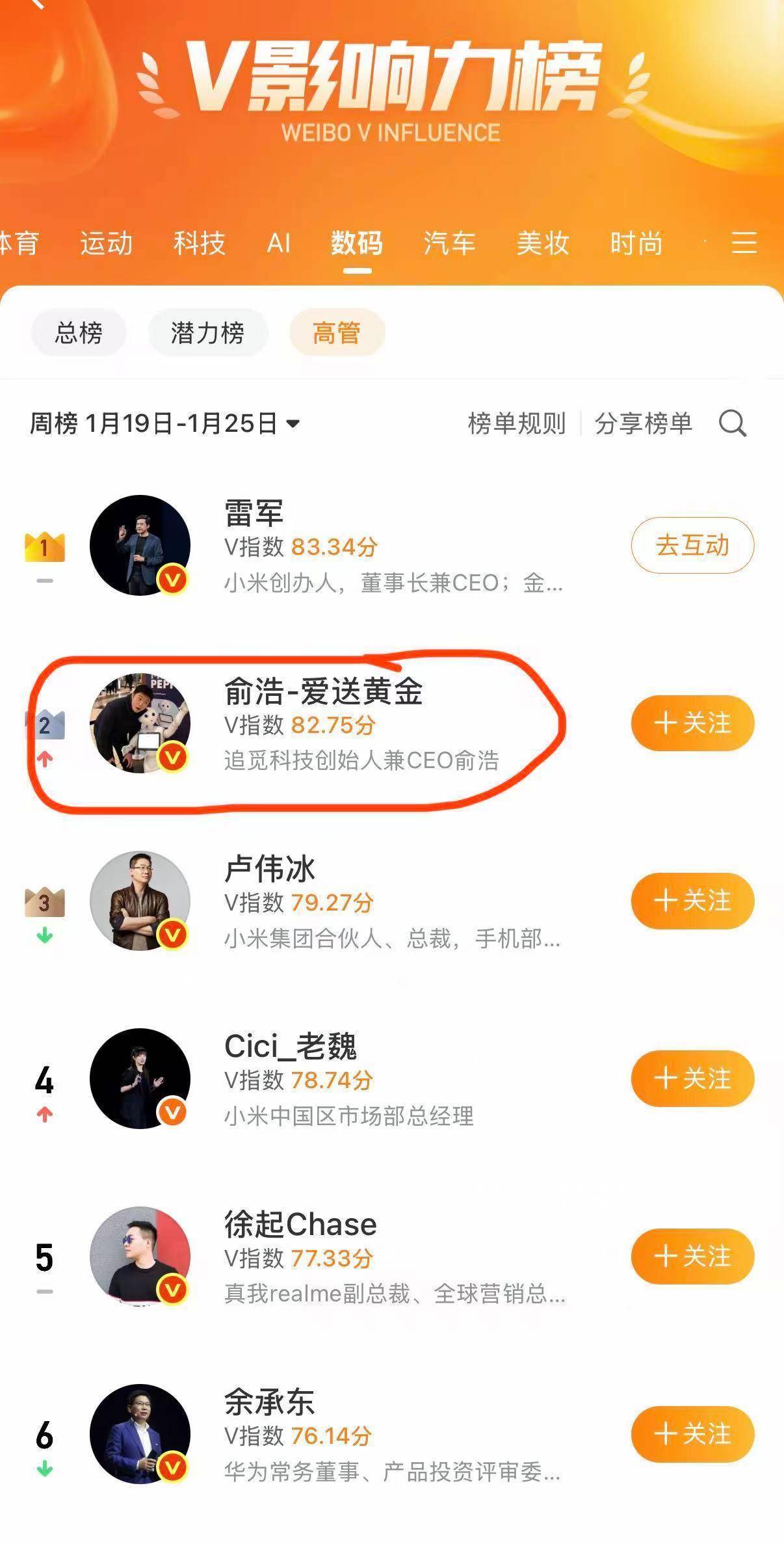 本日,追觅科技首创东说念主兼CEO俞浩晒图表现,俞浩在上周(1月19日-1月25日)冲到微博V影响力榜数码界限下的高管榜单第2名开yun体育网,第又名是雷军。