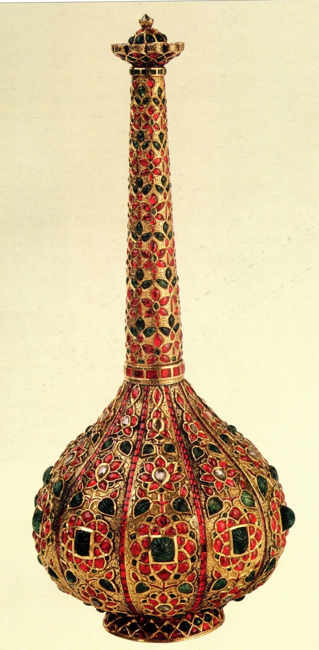 左图为16—17世纪的波斯洒蔷薇露(玫瑰水)玻璃瓶;右图为18世纪莫卧儿王朝的金镶对峙洒蔷薇露瓶
