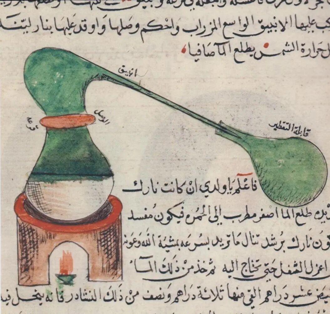 左图为16世纪阿拉伯文件中的蒸馏器;右图为16世纪伊斯兰宇宙的银蒸馏器