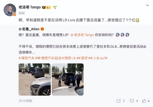 随后,理念念汽车第一产物线总裁汤靖也转发该微博称,“啊,早知说念我是不是应该用L9 Livis去蹭下雷总流量了…嗅觉错过了1个亿”。