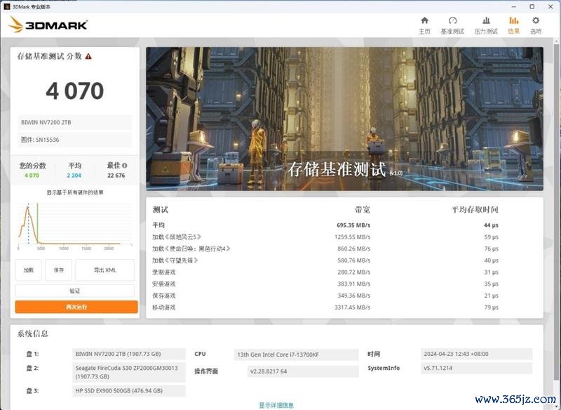 而i7-14700得分4070,达到了旗舰级SSD的水准,平均带宽685MB/s,平均存取技艺44us。