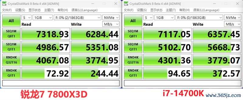 从CrystalDiskMark的收成来看,锐龙7 7800X3D的划定读取速率略高一些,但除此除外的数据皆不如i7-14700K,尽头是4K随即性能,差距越过了30%。