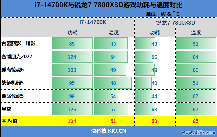 锐龙7 7800X3D的功耗发达异常惊艳,6款游戏平均功耗仅有50W,约为i7-14700K一半。但即就是如斯之低的功耗,其温度发达不错说是说来话长,平均温度为65度,比i7-14700K高了14度。