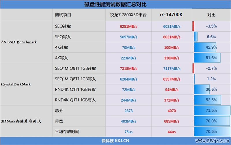 比如AS SSD Benchmark 4K读写性能上,i7-14700K比锐龙7 7800X3D差别快了42%和52%,CrystalDiskMark的开始幅度则能达到30%和52%。