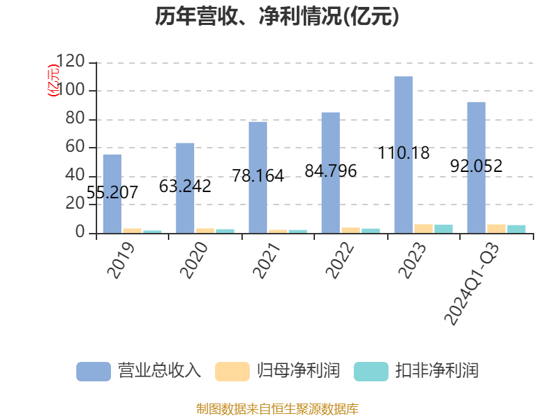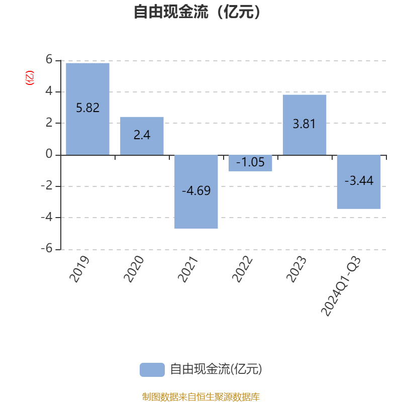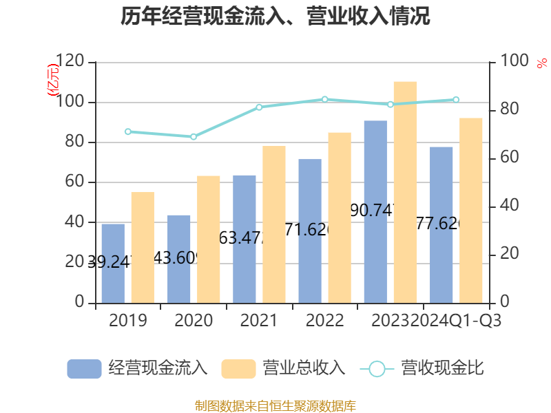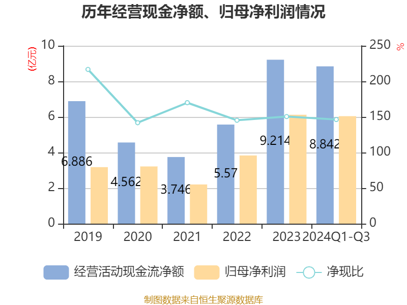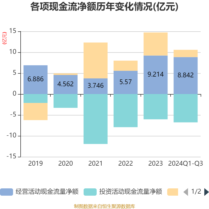 2024年前三季度,公司筹画举止现款流净额为8.84亿元,同比增长93.2%;筹资举止现款流净额1.74亿元,同比减少8.11亿元;投资举止现款流净额-6.77亿元,上年同时为-8.26亿元。
