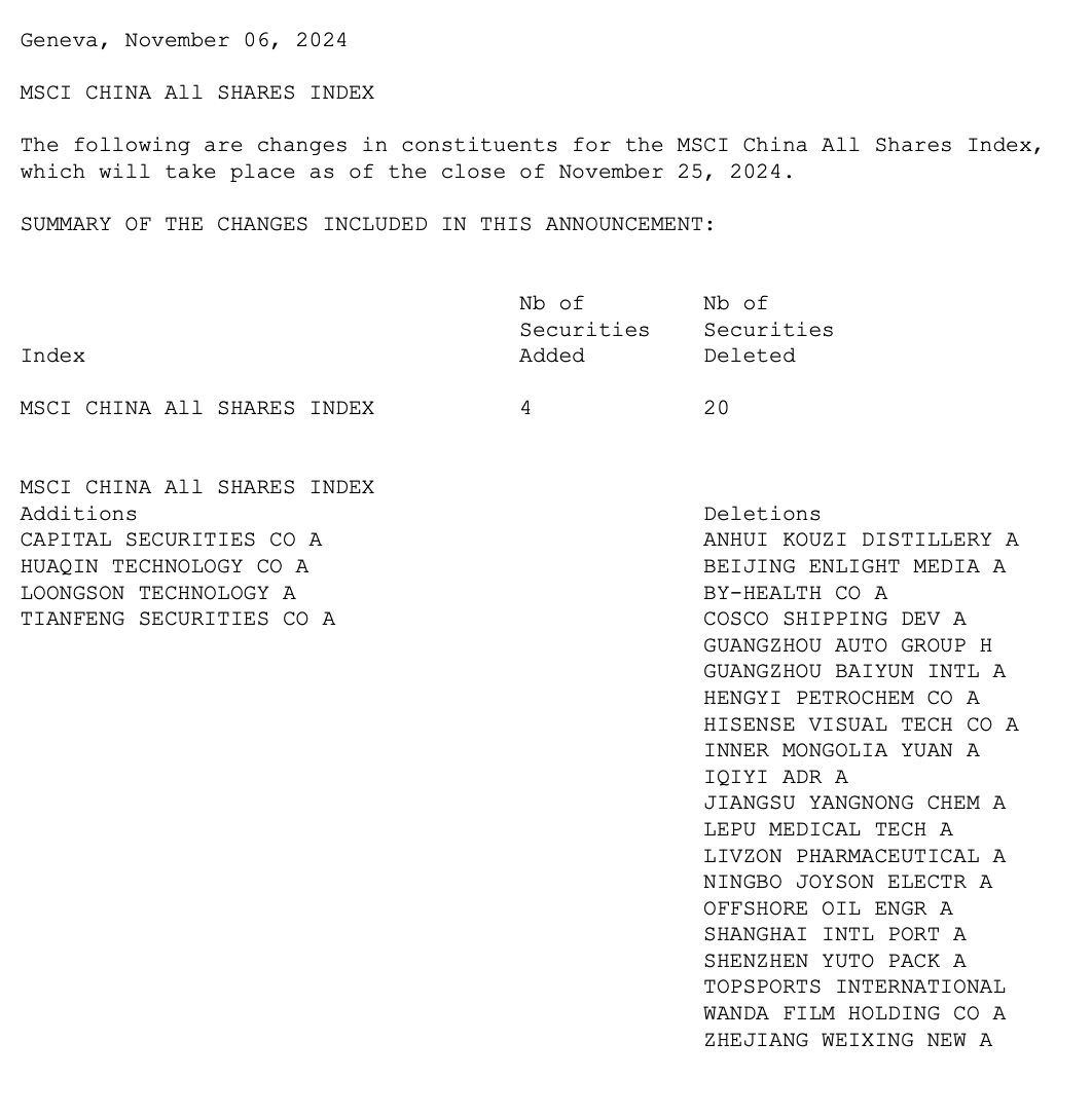 明晟公司(MSCI)公布11月份指数审议效果。本次MSCI大众股票指数(ACWI)纳入22只股票云开体育,剔除57只股票。MSCI中国指数新纳入创始证券、华勤时候、龙芯中科和天风证券4只股票,剔除口子窖、色泽传媒、汤臣倍健、广汽集团、恒逸石化、爱奇艺ADR等20只股票。本次治愈将于11月25日收盘后收效。