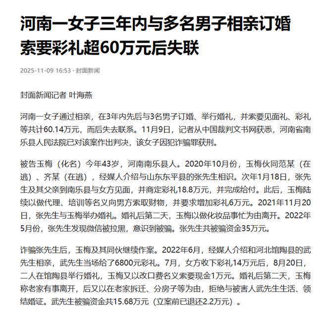 河南一女子通过相亲,在3年内先后与3名须眉订婚、举行婚典,并提取碰面礼、彩礼等共计60.14万元,此后失去干系。11月9日,记者从中国裁判告示网获悉,2025年7月1日,法院作出刑事判决:玉梅犯欺骗罪,被判处有期徒刑十年,并处罚款十万元。责令其退赔各被害东谈主经济失掉共计60.14万元。(据11月10日封面新闻)